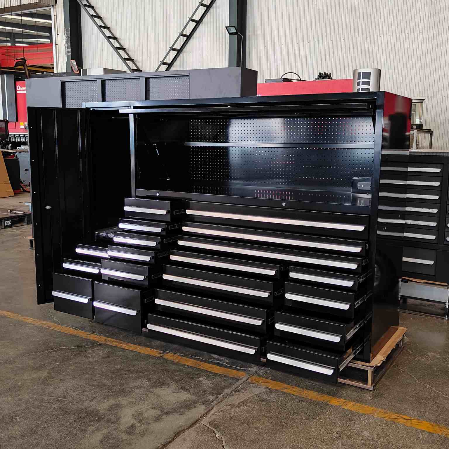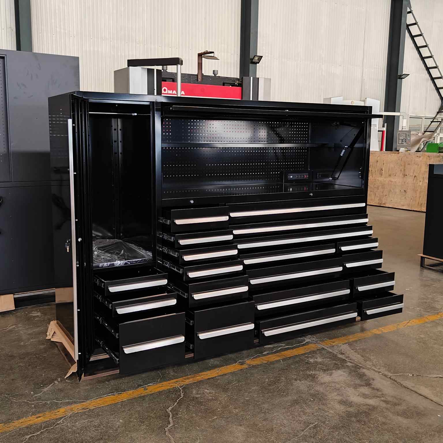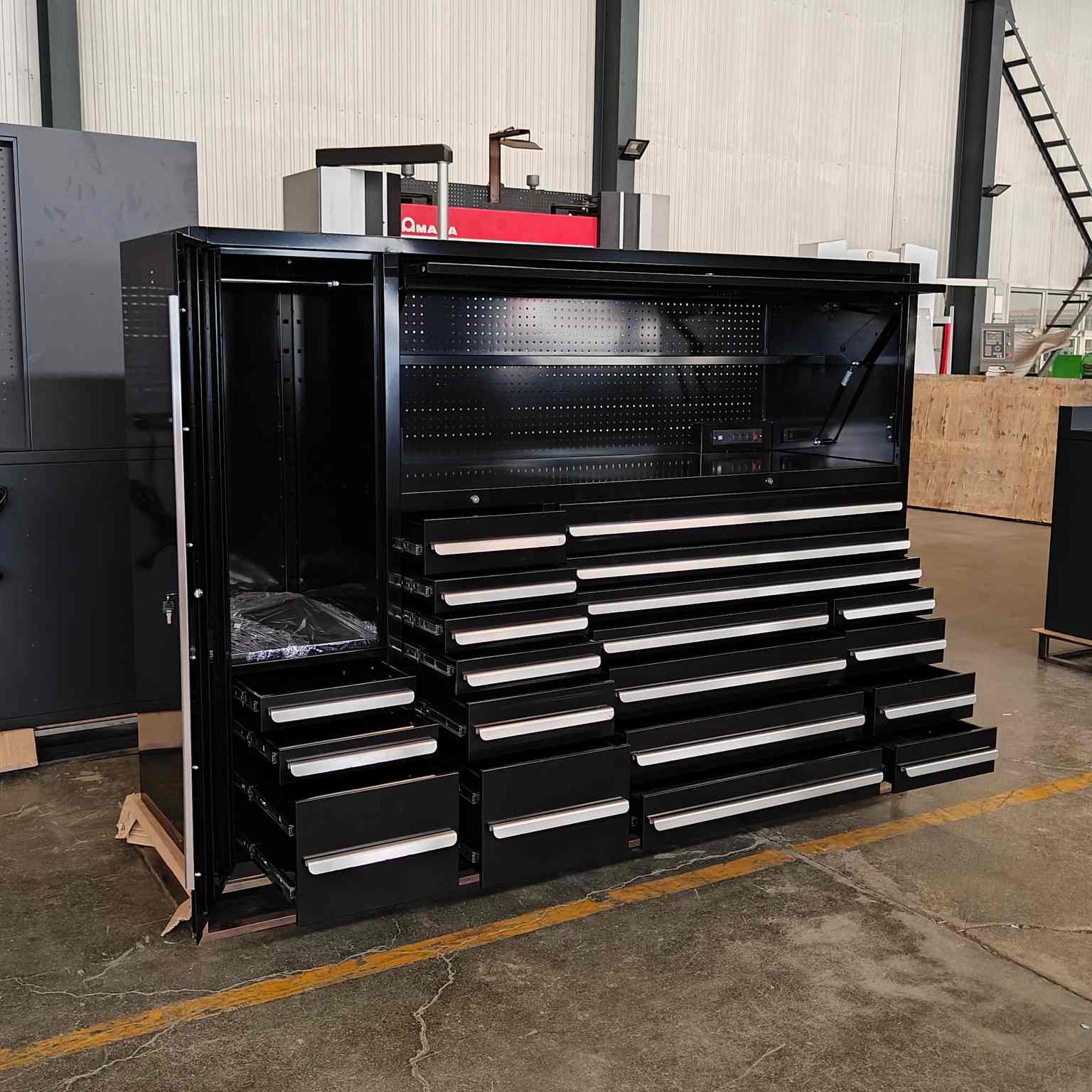 Czarna wielofunkcyjna szafka narzędzi Cyjy może być używana w garażach, domach i warsztatach naprawczych, i jest wyposażony w stojaki narzędzi, gniazdki i szuflady magazynowe. Czarna wielofunkcyjna szafka narzędzi CYJY zapewniła wygodę dla warsztatów fabrycznych.